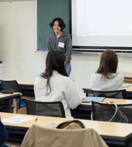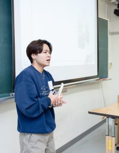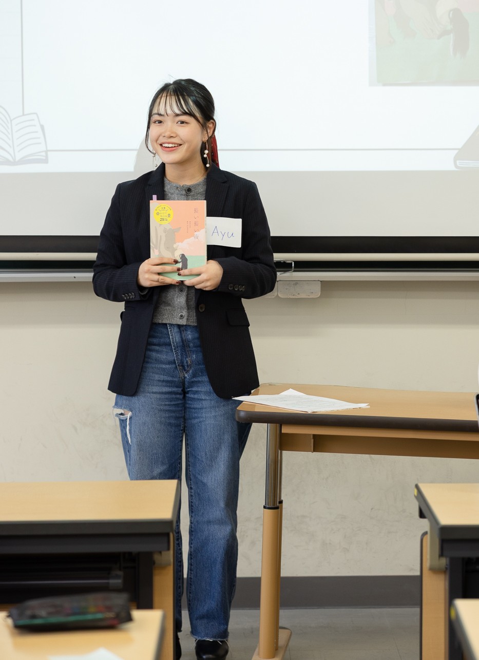 この特別ルールのもと、多言語ビブリオバトル“Books Connect Us!”は、2025年12月19日(金)に開催され、髙橋愛優さん(教育学部1年)、友野徹世さん(教育学部1年)、Xaverius Farrell Lienardyさん(グローバル・ディスカバリー・プログラム2年)の3人の学生が、日頃の学習成果を活かした熱意あるプレゼンテーションを繰り広げました。このイベントには、発表者の他に約20人の学生が聞き手(投票者)として参加しました。そして、投票の結果、ルリ作『長い長い夜』が「最も読みたくなった本」(チャンプ本)に決まりました。