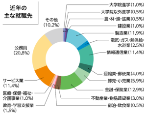 金融業関連や公務員への就職が多いです。これら以外にも製造業、小売業、サービス業関連の企業に就職する人も多いです。 また大学院進学をする人、NPOやNGOに参加する人、少数ですが起業する人もいます。
