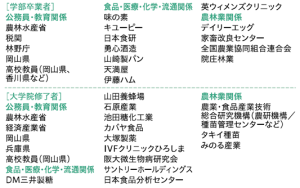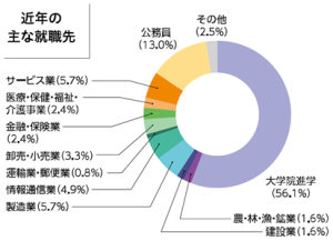 農学部卒業生の多くは大学院に進学しますが、大学院修了生も含めて就職率は高く、その就職先は広範囲にわたります。例年、食品・農業・医薬品関連企業をはじめ、医療機関、機械メーカー、公務員(国、県、市)などへ就職する学生もたくさんいます。また、大学院修了生では、大学・研究機関・民間企業の研究職や技術職として活躍している卒業生が多くいます。