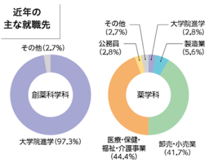 薬学科(6年制)の場合、卒業生は薬剤師として、病院と保険調剤薬局にそれぞれ3分の1、そして企業や公務員といった職種にも就職しています。 また創薬科学科(4年制)の場合、ほとんどの卒業生が大学院に進学して、研究の技術や知識の専門性を高めた後、就職しています。